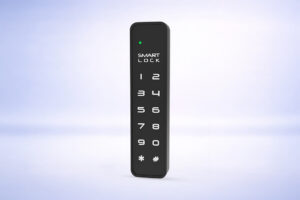 Designed to unlock through a clean touch-button keypad interface for convenient access.